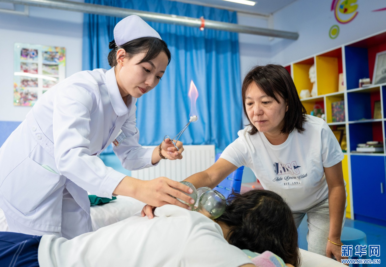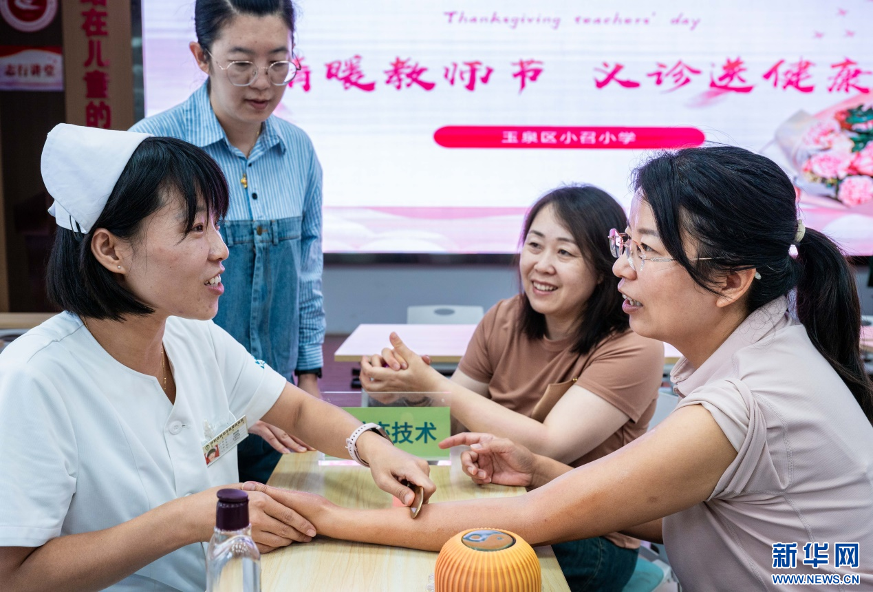 9月9日,醫(yī)護(hù)人員在呼和浩特市玉泉區(qū)小召小學(xué)為老師們艾灸。新華網(wǎng)發(fā)(丁根厚 攝)