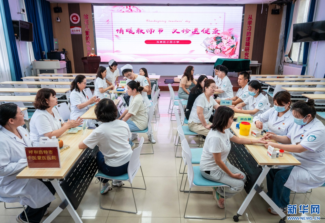 9月9日,醫(yī)護(hù)人員在呼和浩特市玉泉區(qū)小召小學(xué)為老師們進(jìn)行中醫(yī)蒙醫(yī)診療。新華網(wǎng)發(fā)(丁根厚 攝)