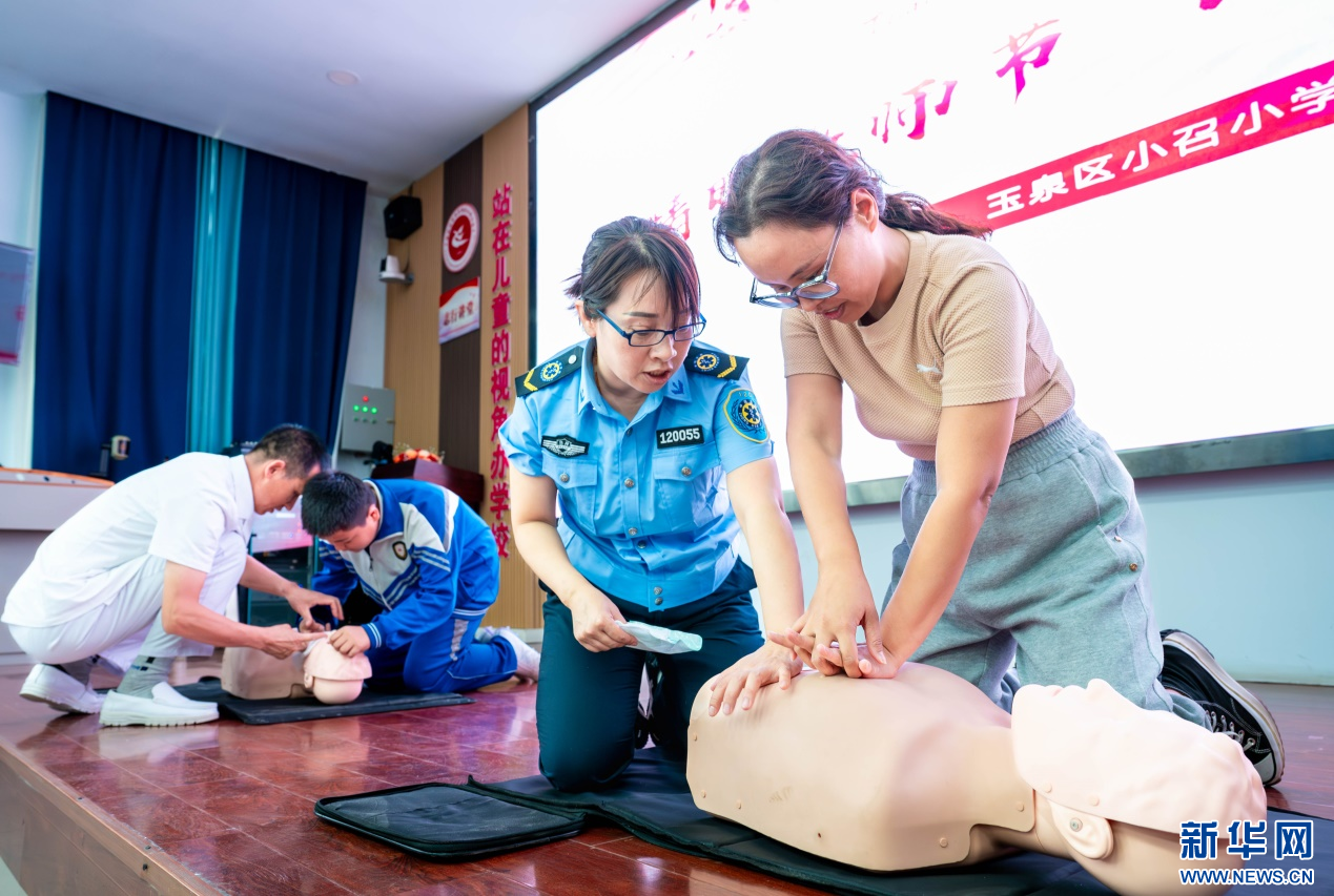 9月9日,醫(yī)護(hù)人員在呼和浩特市玉泉區(qū)小召小學(xué)指導(dǎo)師生練習(xí)心肺復(fù)蘇技能。新華網(wǎng)發(fā)(丁根厚 攝)