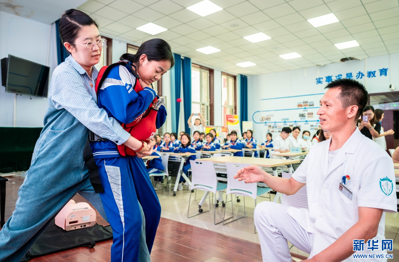 9月9日,醫(yī)護(hù)人員在呼和浩特市玉泉區(qū)小召小學(xué)指導(dǎo)師生練習(xí)海姆立克急救法。新華網(wǎng)發(fā)(丁根厚 攝)