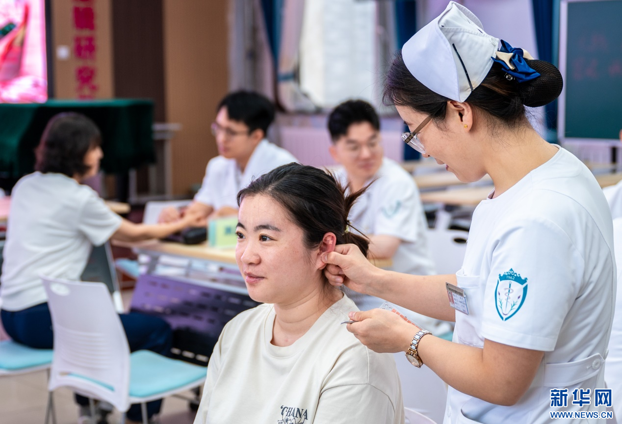 9月9日,醫(yī)護(hù)人員在呼和浩特市玉泉區(qū)小召小學(xué)為老師們做耳穴貼壓。新華網(wǎng)發(fā)(丁根厚 攝)