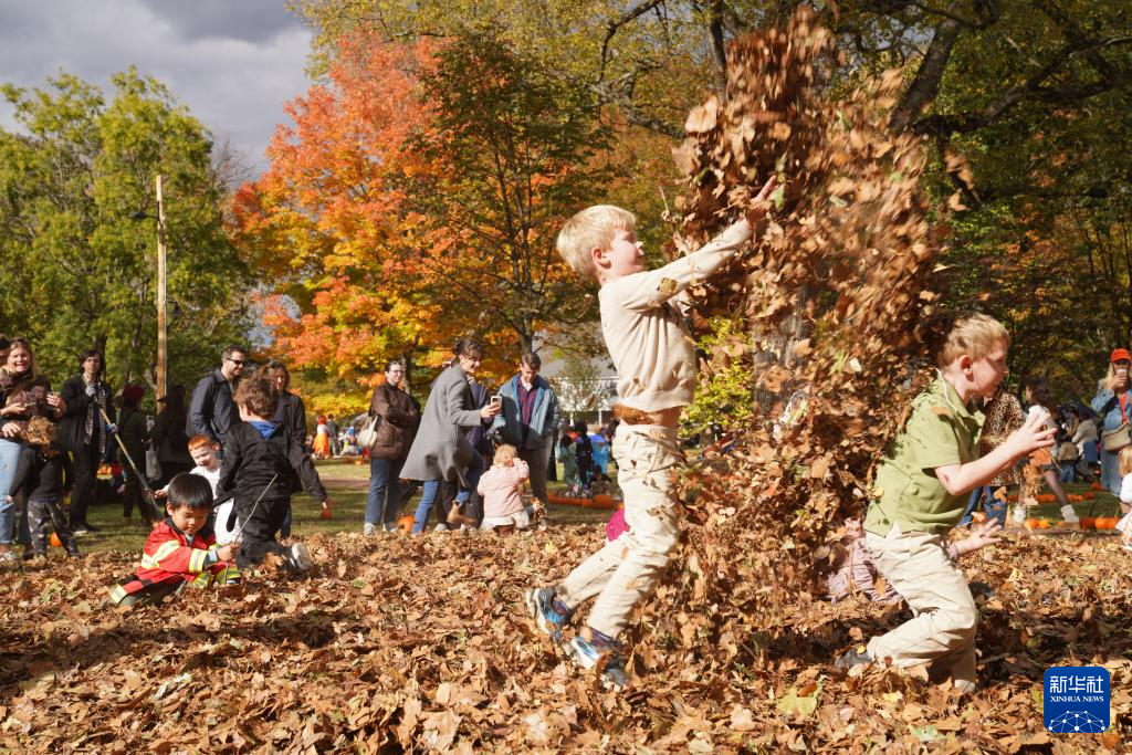 10月25日,在美國紐約總督島,兒童在落葉中玩耍。