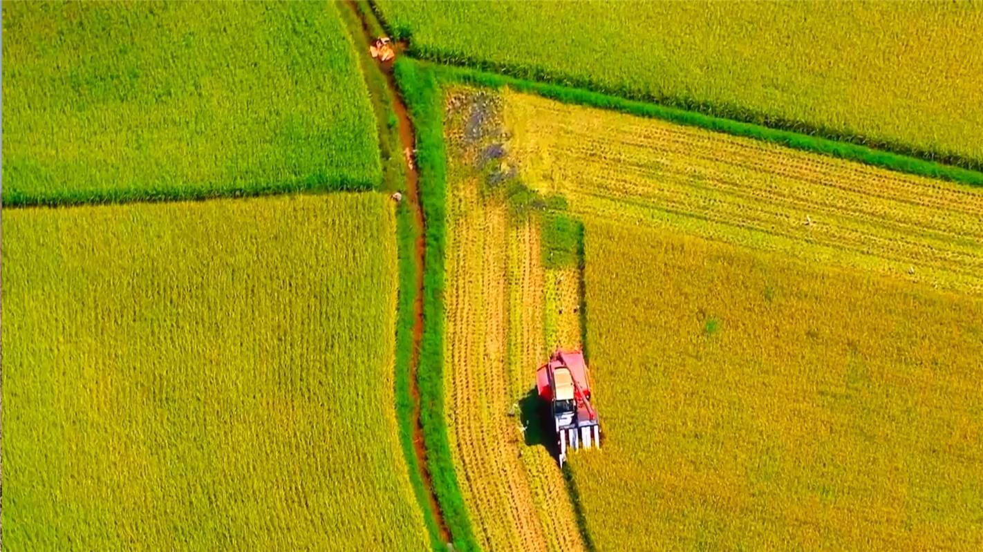 翁牛特旗海拉蘇鎮(zhèn)稻蟹共生試驗(yàn)田里,農(nóng)民在用機(jī)械收割水稻。