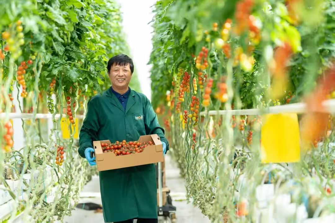 喀喇沁旗宏?,F(xiàn)代農(nóng)業(yè)產(chǎn)業(yè)園日光溫室內(nèi),五彩斑斕的“宏福柿”掛滿了枝頭。
